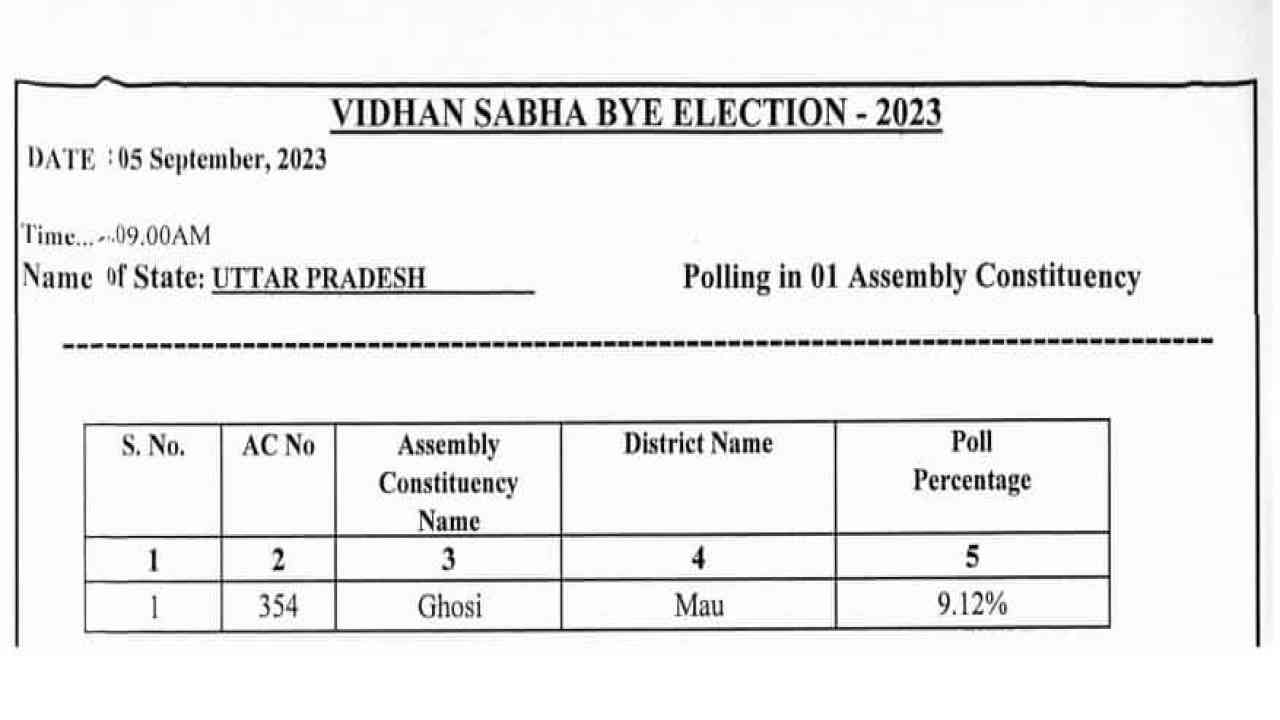 घोसी विधानसभा सीट पर उपचुनाव के लिए 10 अगस्त से नामांकन की प्रक्रिया शुरू हुई. वहीं 17 अगस्त को नामांकन की आखिरी तारीख थी. वहीं आज यानि 5 सितंबर को वोटिंग हो रही है और 8 सितंबर को रिजल्ट आएगा.